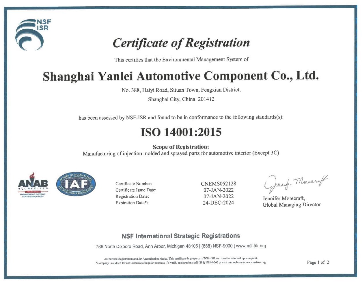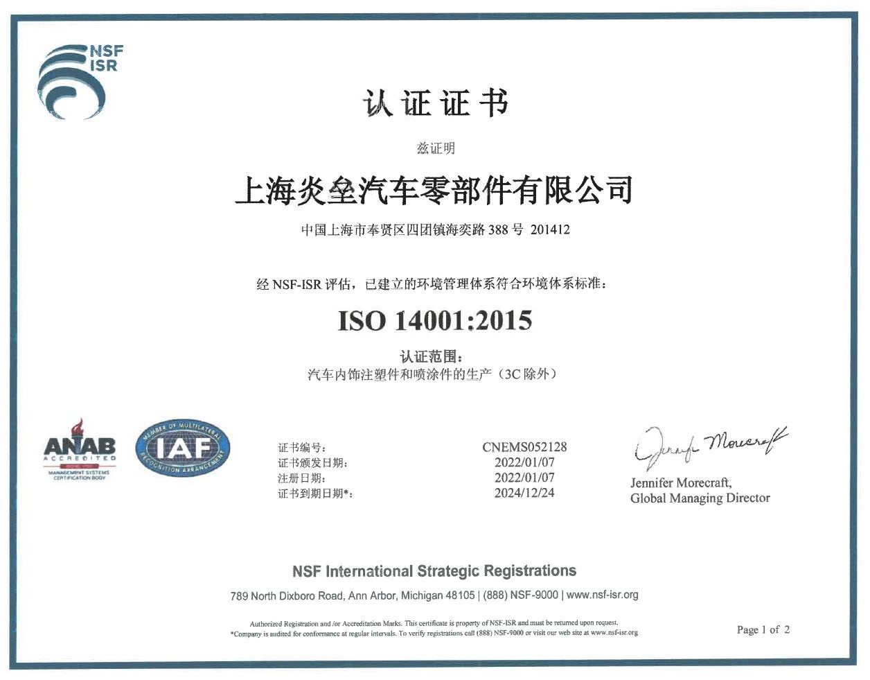 2018年12月份獲得了環(huán)境ISO 14001認證證書