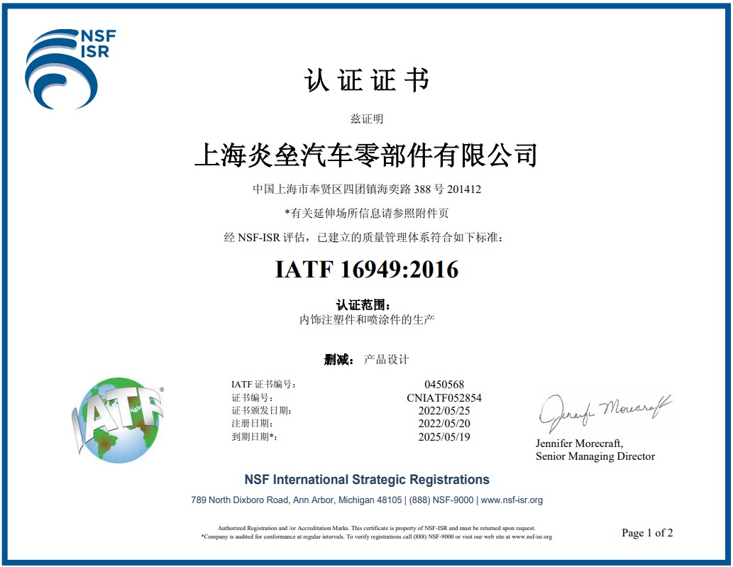 2019年5月份獲得了ITAF/TS 16949質量管理體系認證證書。